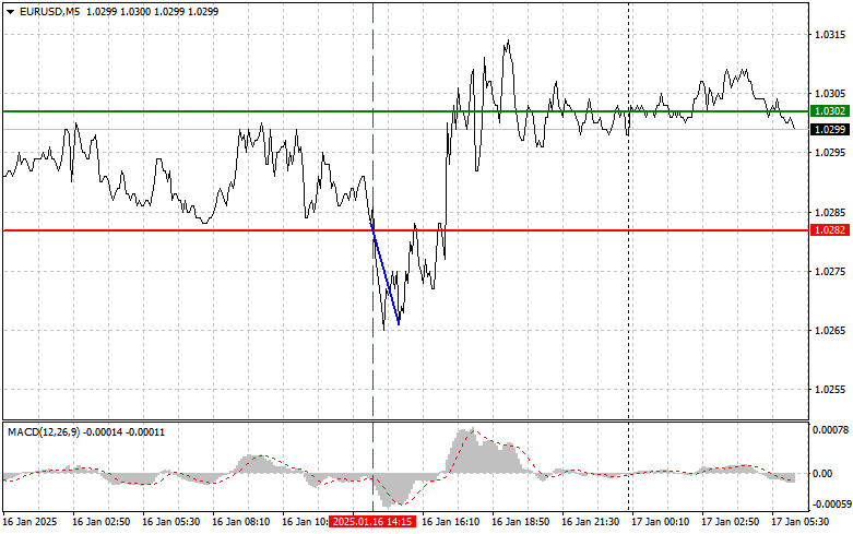 K otestování cenové úrovně 1,0282 v odpoledních hodinách došlo ve chvíli, když indikátor MACD začal klesat od nuly, což potvrdilo, že se jedná o platný bod pro vstup do trhu. V důsledku toho pár klesl o zhruba 15 bodů, než tlak na dolar polevil.