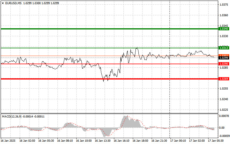 Scénář č. 1: Dnes nakupte euro, pokud cena dosáhne úrovně 1,0313 (zelená čára v grafu), s cílem dosáhnout úrovně 1,0340. Na úrovni 1,0340 plánuji z trhu vystoupit a prodat euro v opačném směru s cílem dosáhnout pohybu o 30–35 pipsů od místa vstupu. Růst eura v první polovině dne očekávám pouze v případě zveřejnění příznivých údajích. Důležité! Před nákupem se ujistěte, že se ukazatel MACD nachází nad nulou a začíná růst.