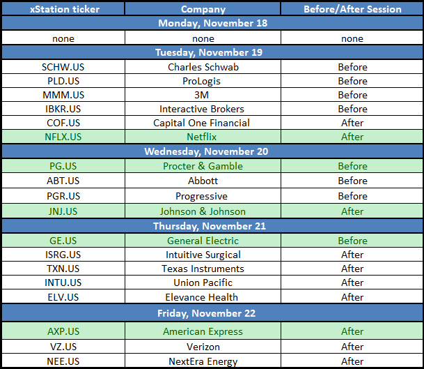 V úterý se pozornost investorů zaměří především na Netflix, zatímco středa přinese výsledky společností jako P&G a Johnson & Johnson. Ve čtvrtek General Electric zveřejní své výsledky. Níže je uveden seznam nejdůležitějších publikací naplánovaných na tento týden.