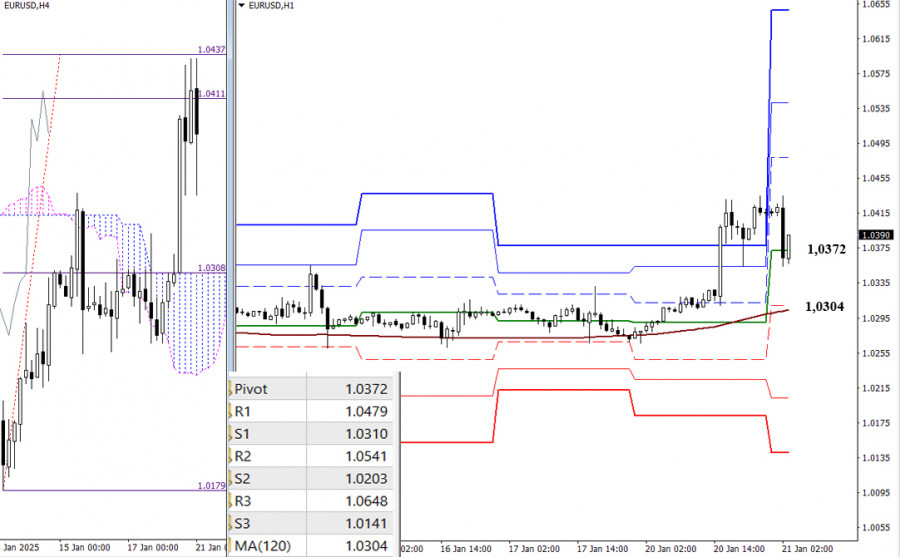 V nižších časových rámcích mají aktuálně navrch býci. Včera se jim podařilo vytvořit a téměř plně dosáhnout cíle pro proražení cloudu Ichimoku ve H4 grafu (1,0411–1,0437). Díky tomuto úspěchu se dnes rozšířily klasické pivotní úrovně. Po překonání cíle 4H grafu na úrovni 1,0437 se pár pravděpodobně vydá směrem k úrovním rezistence klasického systému pivotů (1,0479–1,0541–1,0648). Pokud se však medvědům podaří vytvořit korekci proražením pod support na centrální úroveň pivotu (1,0372), mohl by pár zamířit k týdennímu dlouhodobému trendu na úrovni 1,0304. Tento trend diktuje současnou rovnováhu sil a jeho prolomení by mohlo přesunout výhodu na stranu medvědů. Dalšími intradenními cíli pro pohyb směrem dolů jsou supporty na klasických pivotech (1,0203–1,0141).***