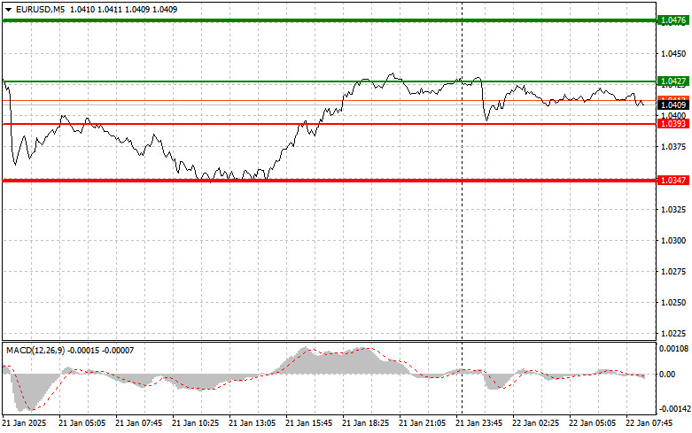 Scénář č. 1: Nákup eura dnes zvažte po dosažení cenové úrovně 1,0427 (zelená linie v grafu) s cílem 1,0476. Na úrovni 1,0476 hodlám opustit trh a prodat euro v opačném směru s cílem pohybu o 30–35 pipů od vstupního bodu. V první polovině dne očekávám růst eura a pokračování uptrendu. Důležité! Před nákupem se ujistěte, že indikátor MACD je nad linií nula a právě začíná stoupat.
