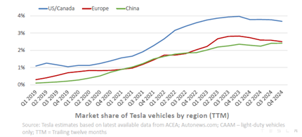 Vývoj tržního podílu společnosti Tesla dle regionů