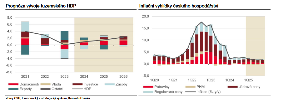 Měnová politika působí se zpožděním, ČNB dnes reálně cíluje rok 2026, kdy podle naší prognózy jí sledovaná míra inflace bude přesně na cíli. Podpotenciální hospodářský růst znamená, že měnové podmínky jsou příliš utažené. Po prosincové pauze tedy předpokládáme, že se bankovní rada na zasedání v příštím týdnu vátí k politice uvolňování a opětovně sníží úrokové sazby. A takto podle nás bude pokračovat na každém zasedáním během první poloviny roku. Klíčová sazba ČNB by tak v létě měla být na třech procentech.