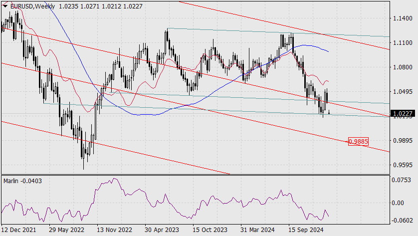 Euro v týdenním grafu dosáhlo vnořené linie tyrkysového klesajícího cenového kanálu. Zatímco účastníci trhu vyhodnocují důsledky Trumpova rozhodnutí, euro by mohlo uzavřít vzniklý gap. Jakmile to udělá, očekáváme další pokles k úrovni supportu 1,0135 a možná i do pásma 0,9988–1,0030. Strategickým cílem je kurz 0,9885, který odpovídá vnořené linii červeného cenového kanálu.