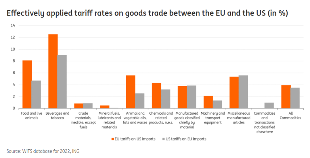 Největšími dovozci z USA jsou v EU Nizozemsko a Belgie, domovy jedněch z největších přístavů Atlantiku. Celkový dovoz EU z USA dosahuje zhruba dvou procent unijního HDP.