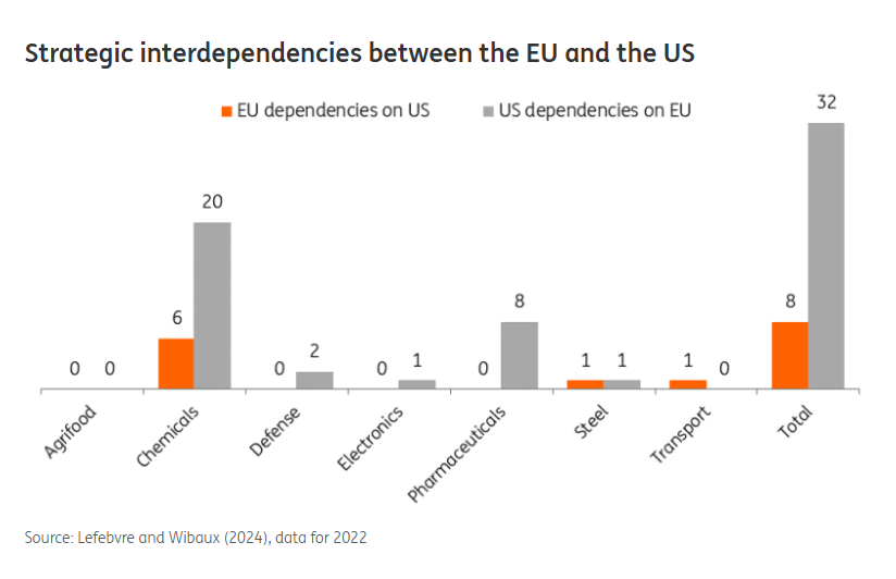 Naproti tomu Spojené státy dováží z EU čtyřikrát více strategicky důležitých produktů, totiž 32 (viz graf níže).