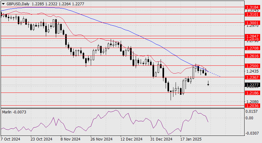 V pátek se dolarový index propadl o 0,29 %, což způsobilo, že britská libra získala 28 pipsů. Tento mírný zisk stačil na to, aby se na denním grafu vyšplhala nad linii rovnováhy a dokonce otočila oscilátor Marlin směrem vzhůru. -