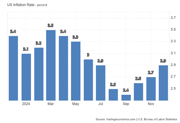 Pokud se zaměříme na inflaci, vidíme, že v září 2024 klesla na 2,4 %, což byla nejnižší úroveň od února 2021. Tento pokles naznačuje, že díky agresivní měnové politice FEDu a vyšším úrokovým sazbám se inflaci podařilo zkrotit. Nicméně nelze tvrdit, že boj s inflací je již u konce. Inflační tlaky zůstávají v pozadí, protože od října 2024 začala míra inflace opět mírně růst a v současnosti se nachází na úrovni 2,9 %, což je na horní hranici cílového pásma FEDu.