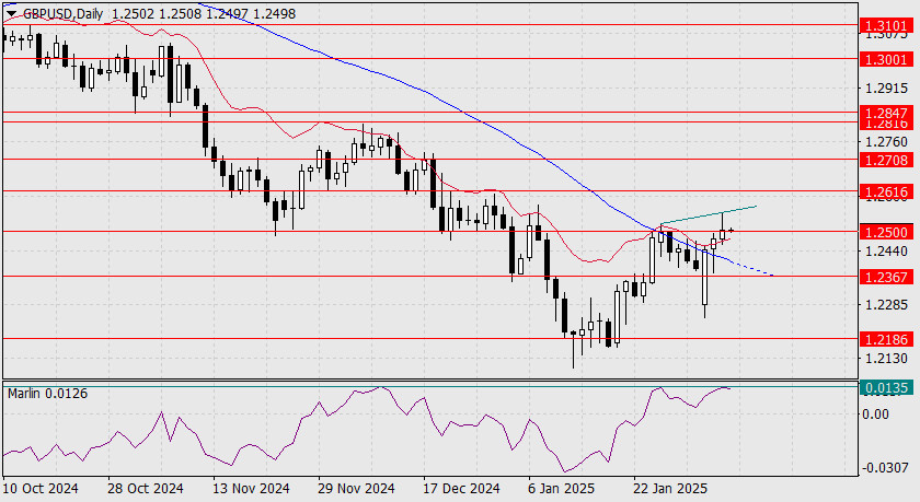 Včera britská libra zaznamenala výrazný růst, kdy prorazila pásmo rezistence mezi 1,2816 a 1,2847. Dnes ráno libra pokračuje v růstu směrem k dalšímu cíli na úrovni 1,3001, která odpovídá minimu ze dne 11. září 2024. Nicméně oscilátor Marlin v denním grafu naznačuje známky vyčerpání. -
