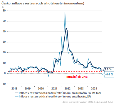 Dobrou zprávou je naopak zvolnění inflačního momenta v případě stravování a ubytování (2,9 %) a také rekreace a kultury (3,3 %). I tak ale zůstává cenová dynamika ve službách zvýšená a jedná se nadále o nejvíce setrvačnou položku v rámci spotřebitelského koše.