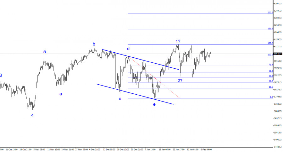 Je patrná dokončená korekční struktura a-b-c-d-e. Zdá se, že trend z 13. ledna vytvořil nový pětivlnný impuls, přičemž vlny 1 a 2 byly dokončeny. Pondělní pokles však tuto strukturu narušil, takže je nejasná a nespolehlivá. Struktura v denním grafu je spolehlivější a měla by být považována za prioritní. Analýza vln musí být jasná a jednoduchá – se složitými strukturami je obtížnější obchodovat se ziskem.