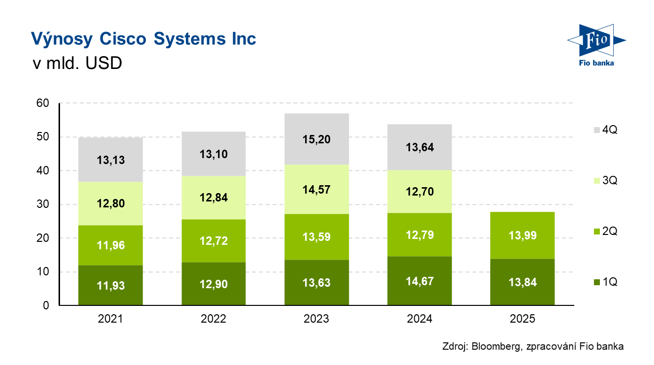 Americká technologická společnost Cisco reportovala výsledky za třetí kvartál fiskálního roku 2025. Pozitivně je trhem hodnocen roční výhled, který byl navýšen z důvodu růstu poptávky po umělé inteligenci. -