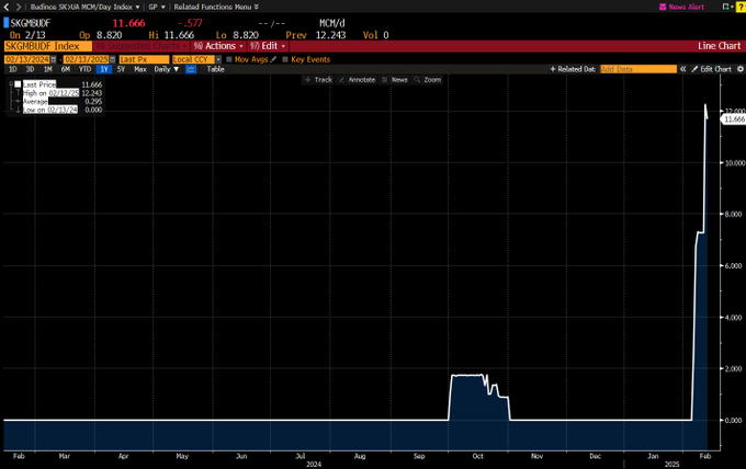 Zatímco ještě do začátku tohoto měsíce neprotékal předávací stanicí Budince ani jeden jediný krychlový metr plynu, třeba včera přeteklo přes toto slovensko-ukrajinské pomezí hned 11,7 milionu metrů krychlových (viz graf Bloombergu níže).
