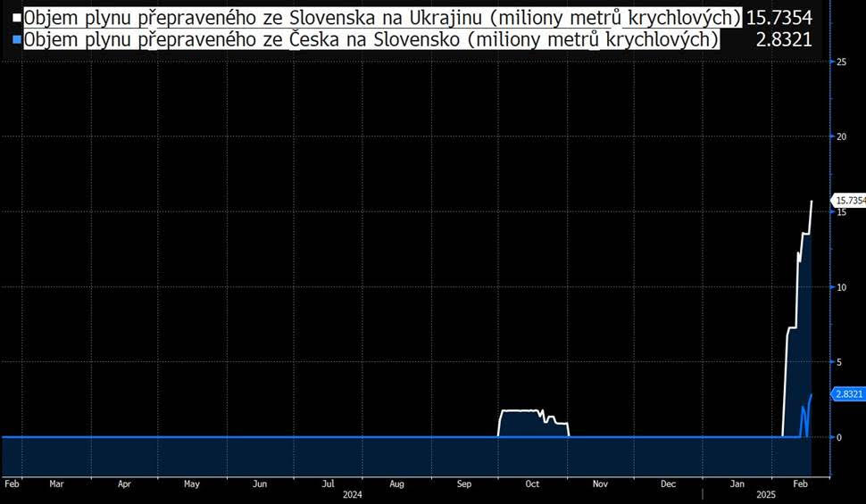 Objem plynu, který teče z Česka na Slovensko, aby dále pokračoval na Ukrajinu, je titěrný nejen v porovnání s objemem plynu, který z Česka na Slovensko tekl do roku 2022, víceméně do ukončení přepravy plynovodem Nord Stream. Je titěrný totiž také v porovnání s objemem plynu, který aktuálně, v těchto dnech začal téci ze Slovenska na Ukrajinu (viz graf 2).