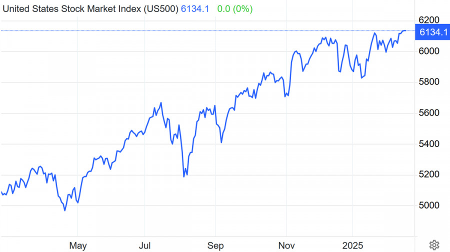 Index S&P 500 se obchoduje na úrovni 6 134 a drží se tak v blízkosti rekordních hodnot. Klíčová rezistence se nachází na úrovni 6 150; index ji zatím nedokázal překonat. Jasný průraz by mohl urychlit růst k pásmu 6 180 –6 200, kde by mohlo zesílit vybírání zisků.