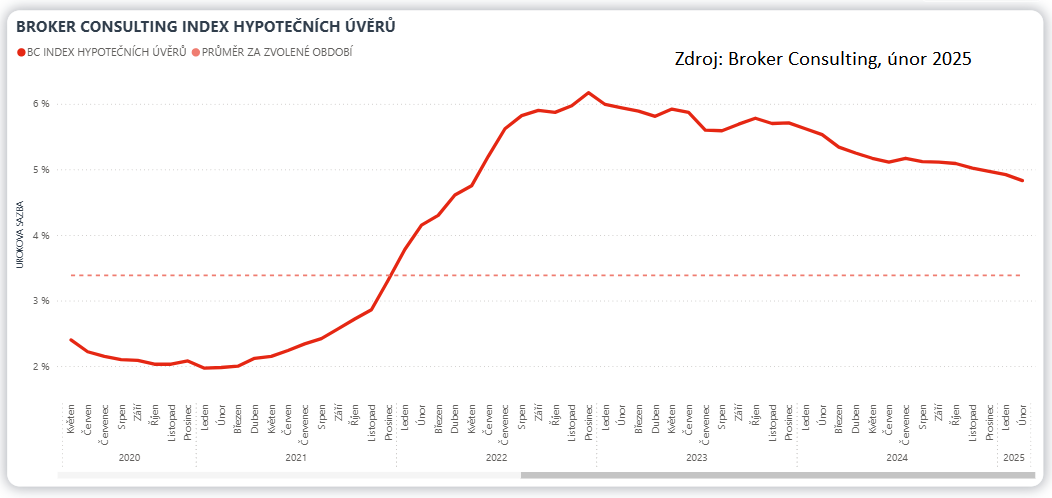Situace na hypotečním trhu je poměrně stabilní. Průměrné úrokové sazby ani v únoru nevybočily ze zaběhnutého tempa a klesaly velmi pozvolně, o čemž vypovídají data Broker Consulting indexu hypotečních úvěrů. Zatímco na počátku roku dosahoval index hodnoty 4,92 procenta, v únoru se zastavil na hodnotě 4,83 procenta, tedy o 0,09 procentního bodu níže. Předstihový ukazatel nezměněn na hodnotě 5,05 procenta. Nejblíže letošní únorové hodnotě byly úrokové sazby naposledy v květnu roku 2022, kdy vystoupaly na 4,75 procenta.