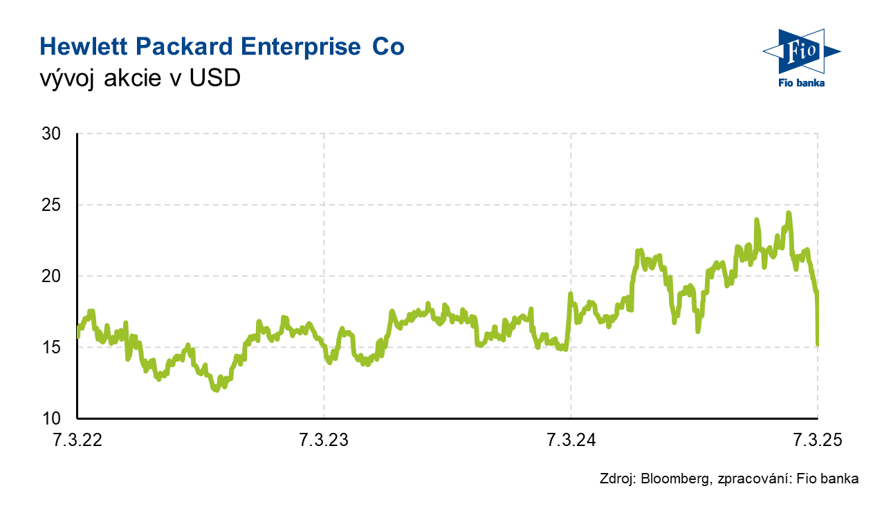 Americká IT společnost Hewlett Packard Enterprise zveřejnila své kvartální výsledky za 1Q 2025. Výsledky za 1Q jsou z hlediska výnosů a očištěného zisku na akcii v souladu s analytickým očekáváním. Výhled společnosti je podle analytiků velkým zklamáním, neboť na 2Q projektuje očištěný zisk na akcii v rozmezí 0,28 až 0,34 USD s očekáváním 0,48 USD. Dále výnosy ve 2Q společnost projektuje ve výši 7,2 až 7,6 mld. USD, což je opět pod očekáváním 7,94 mld. USD.