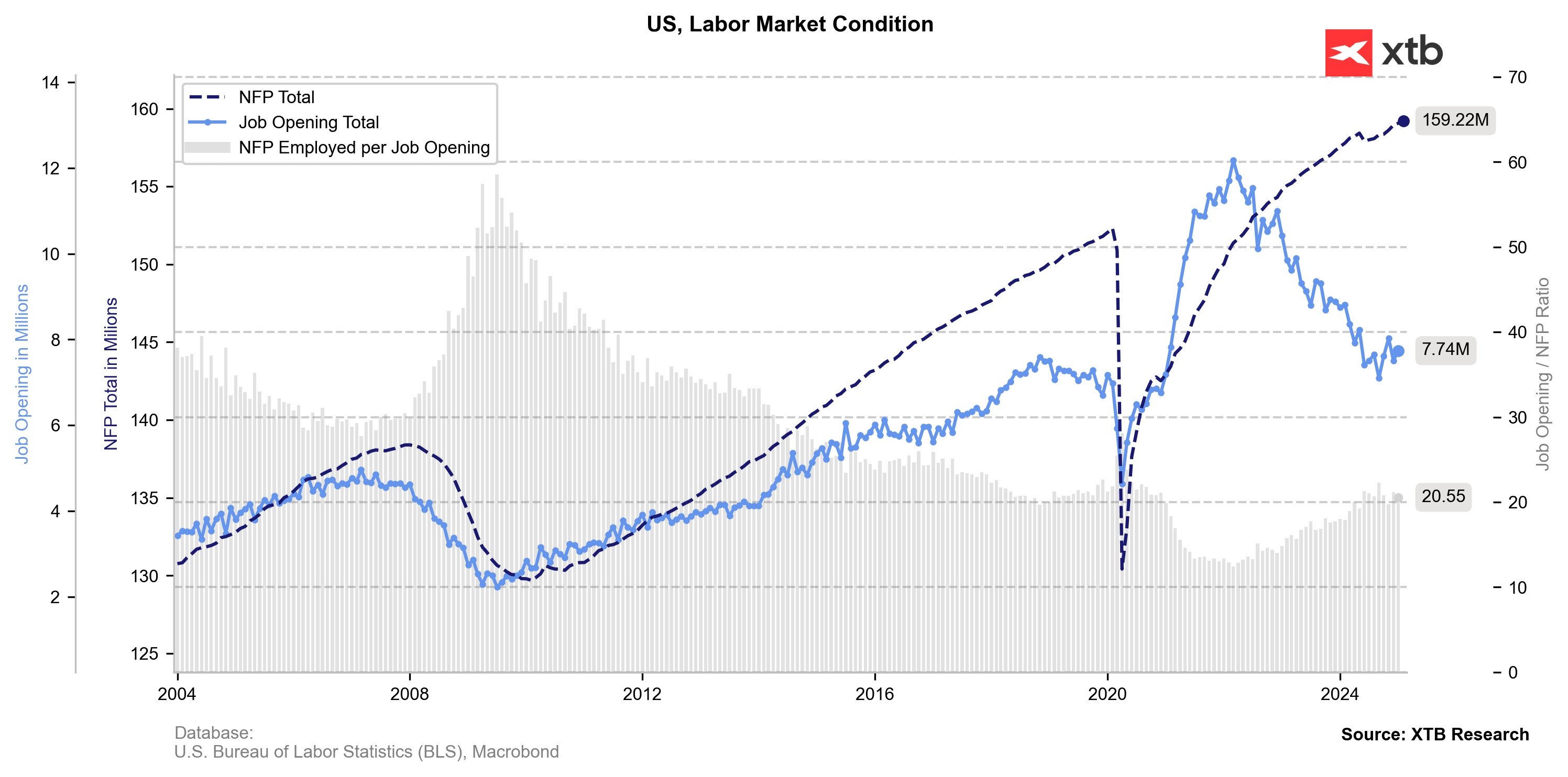 Optimistická zpráva JOLTS mírně zmírnila obavy z recese, čímž vyvážila slabší data ADP a NFP z minulého týdne. Nejvíce volných pracovních míst bylo v soukromém sektoru a vzdělávání (6,86 a 1,63 milionu), zatímco stavebnictví a výroba vykázaly nejmenší, avšak stále pozitivní dynamiku (236 tisíc a 462 tisíc). EUR/USD po zveřejnění dat zastavil svůj růst.