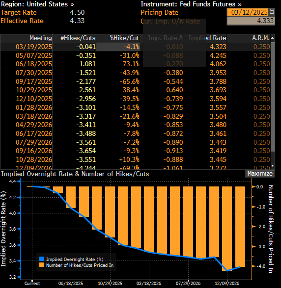 Obchodníci nadále plně počítají s prvním snížením úrokových sazeb o čtvrt procentního bodu v červnu, přičemž pro celý rok 2025 se očekává uvolnění měnové politiky o přibližně 73 bazických bodů. Ekonomové však varují, že cla by mohla komplikovat další kroky Federálního rezervního systému.