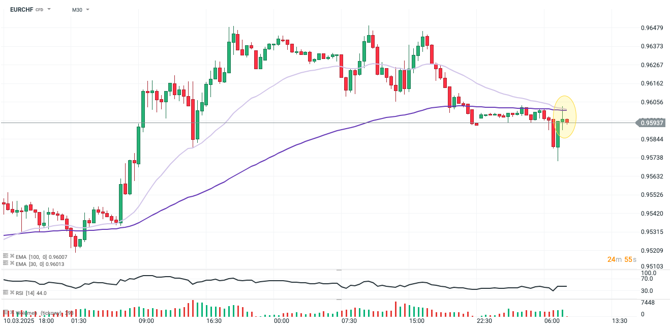 EURCHF mírně klesá v důsledku vyšší dynamiky cen výrobců ve Švýcarsku.Zdroj: xStation5