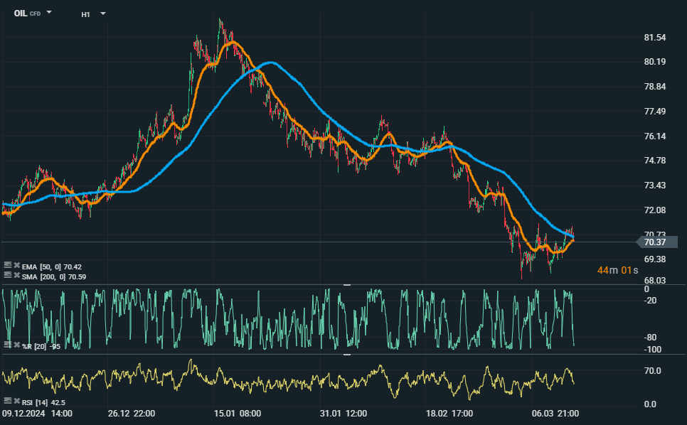 Modrá linie představuje SMA 200 (70,59 USD) a oranžová linie EMA 50 (70,42 USD). Cena se momentálně pohybuje těsně pod těmito úrovněmi, což naznačuje potenciální boj mezi býky a medvědy o další směr vývoje. Pokud cena prorazí nad SMA 200 a udrží se nad ní, mohlo by to signalizovat možnou změnu trendu.