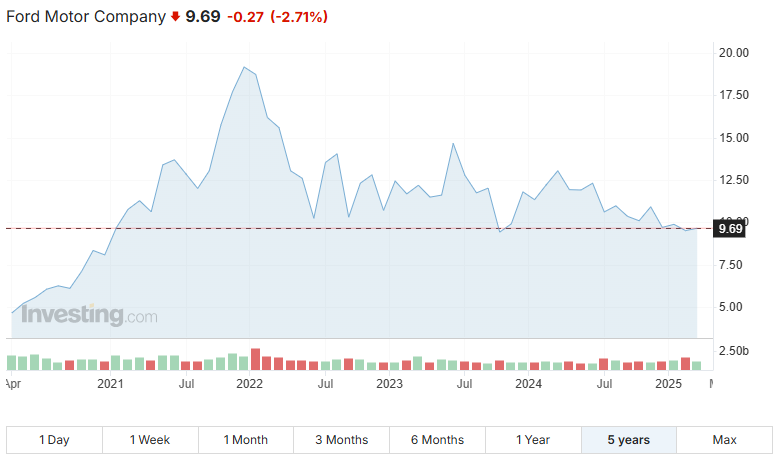Vývoj cen akcií společnosti Ford Motor Company za posledních 5 let