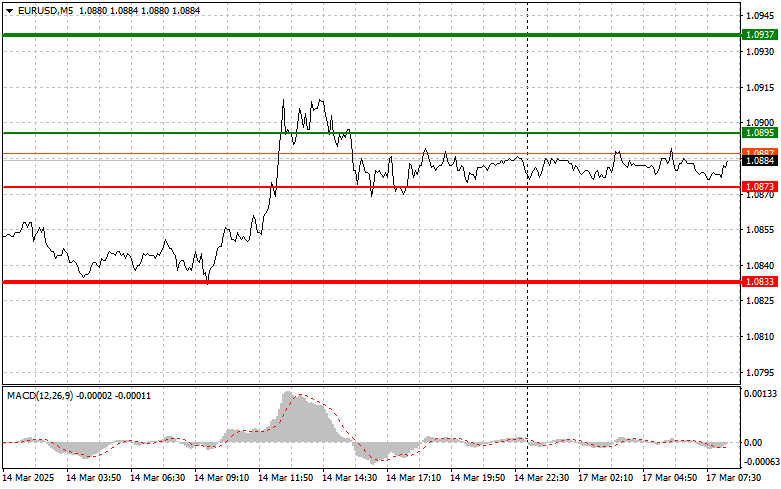 Scénář č. 1: Nákup eura dnes zvážím, pokud cena dosáhne úrovně 1,0895 (zelená linie v grafu), s cílem růstu k 1,0937. Kolem úrovně 1,0937 plánují opustit trh a prodat euro v opačném směru; očekávám pohyb o 30–35 pipů od vstupního bodu. Růst eura v první polovině dne se očekává v rámci pokračujícího uptrendu. Pozor! Před nákupem se ujistěte, že indikátor MACD je nad linií nula a právě začíná stoupat.