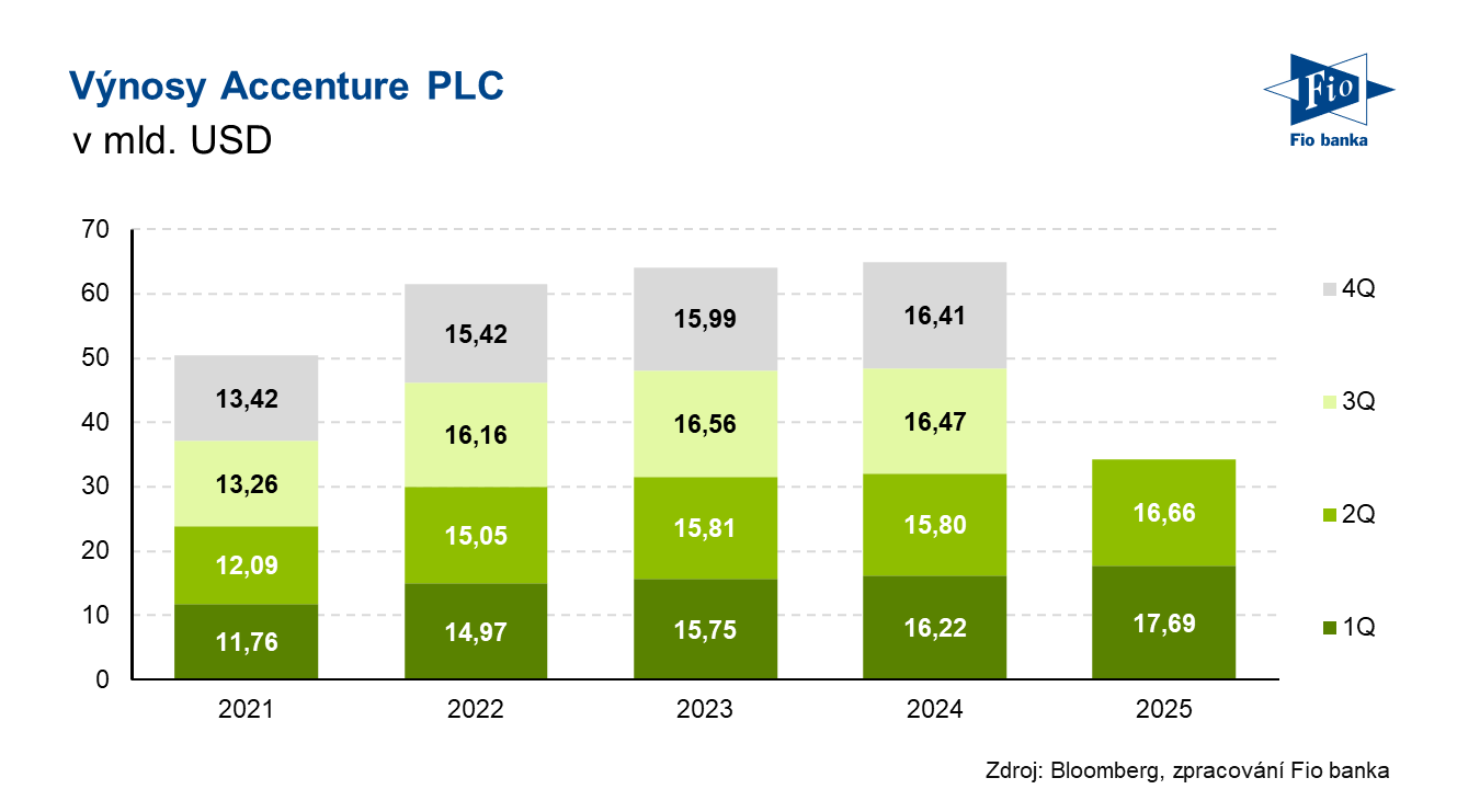 Na 3Q Accenture odhaduje výnosy v rozmezí 16,9-17,5 mld. USD s očekáváním 17,22 mld. USD. Růst výnosů je dle společnosti očekáván mezi 3-7 %.