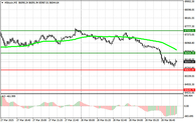 Scénář 2: Bitcoin můžete nakoupit od spodní hranice na 85 600 USD, pokud trh nezareaguje na průraz v opačném směru, s cíli na 86 500 USD a 87 500 USD.