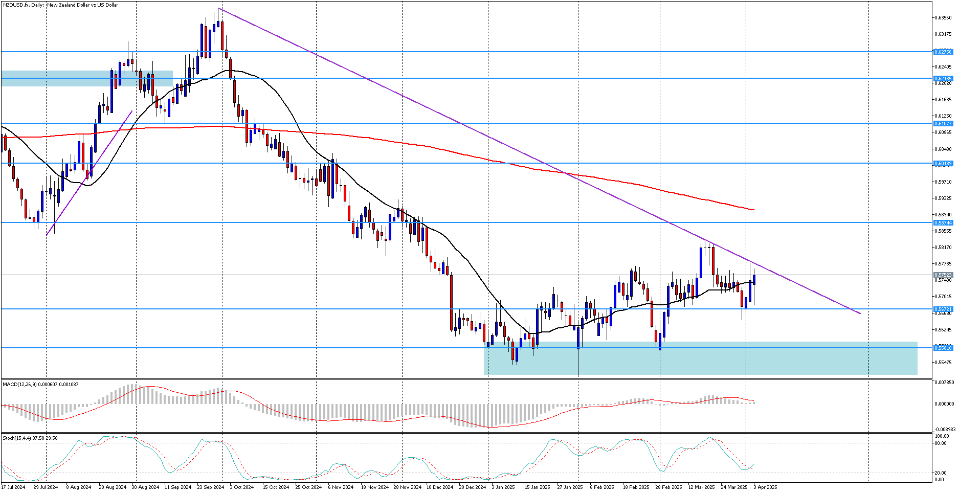 Po prudkém poklesu z minulého týdne NZD/USD zaznamenal výrazný odraz od 50denního jednoduchého klouzavého průměru (SMA) na úrovni 0,5700, jelikož se zdá, že se přeprodaný pokles stabilizoval. Pár posiluje navzdory očekáváním ohledně hrozícího poškození ekonomiky v důsledku recipročních cel, která později během dne oznámí prezident Donald Trump. Momentové ukazatele v této fázi poskytují smíšené signály. MACD ztrácí hybnost těsně nad nulou a pod červenou signální linií, zatímco RSI i stochastický ukazatel se posouvají výše. Tvořený právě překročil neutrální úroveň 50 a druhý jmenovaný tiká vzhůru z přeprodané oblasti. Pokud by odraz, který momentálně pohlcují 20denní a 50denní SMA, postoupil výše, pár by mohl nejprve otestovat strop úzkého rozpětí, v němž se obchoduje od prosince na úrovni 0,5760. Výše by další rezistenci mohla představovat úroveň 0,5844. Na druhé straně by se při trvalém prolomení pod 50denní SMA na úrovni 0,5700 a krátkodobou vzestupnou trendovou linii mohl nejdříve setkat se supportem na úrovni 0,5645 před hladinou 0,5585. Níže by se pár mohl propadnout na 27měsíční minimum 0,5540. NZD/USD se obchoduje na vyšší úrovni a vykazuje známky toho, že nedávné oslabení by se mohlo stabilizovat. Střednědobý výhled však zůstává neutrální, jelikož se cena stále obchoduje v klíčové oblasti přetížení a také pod 200denním SMA.