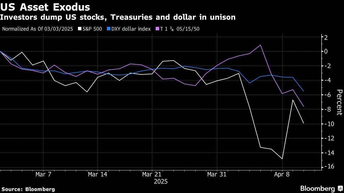 Povážlivé slábnutí dolar vysvětluje, proč americký prezident Donald Trump se svými cly předevčírem couvnul tak nečekaně, že to nečekal ani on sám… Naráz mu padaly akcie, dolar i dlouhodobé dluhopisy, jak zachycuje graf 3 Bloombergu níže. Takové sešikování je historicky mimořádné.