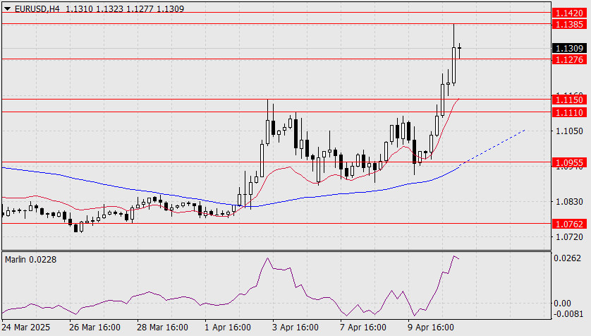 Technický obraz v grafu H4 je podobný: oscilátor Marlin dosáhl lokálního maxima (tentokrát z 3. dubna) a cena se aktuálně pohybuje v blízkosti supportu na úrovni 1,1276.