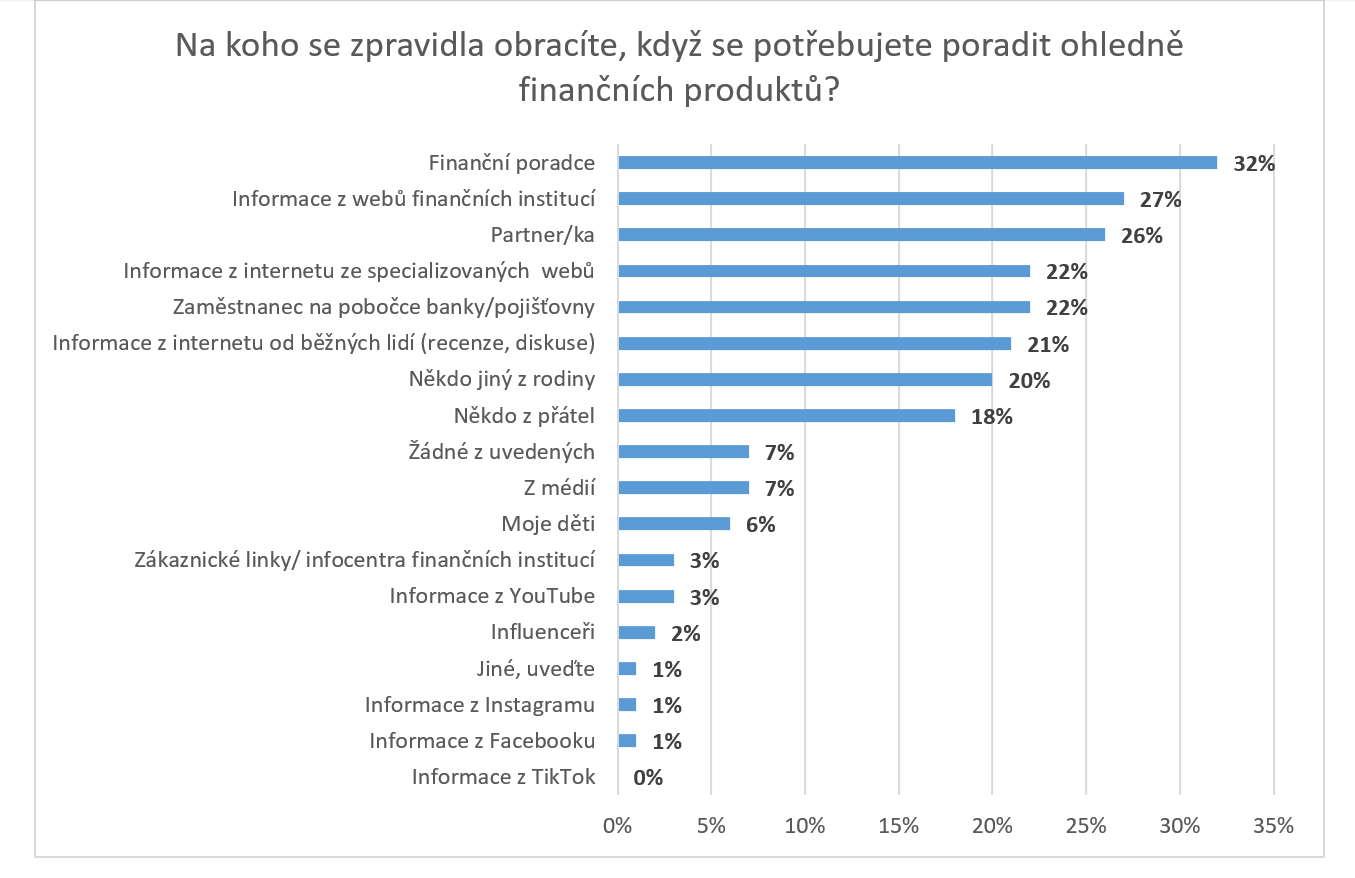 Pokud jde o další zdroje informací, 26 % respondentů uvedlo jako svého finančního „guru“ partnera či partnerku. Téměř stejně často lidé spoléhají na informace z webů finančních institucí (27 %). Významnou roli hrají také rodinní příslušníci – zejména rodiče nebo jiní členové rodiny, na které se spoléhá 20 % lidí.