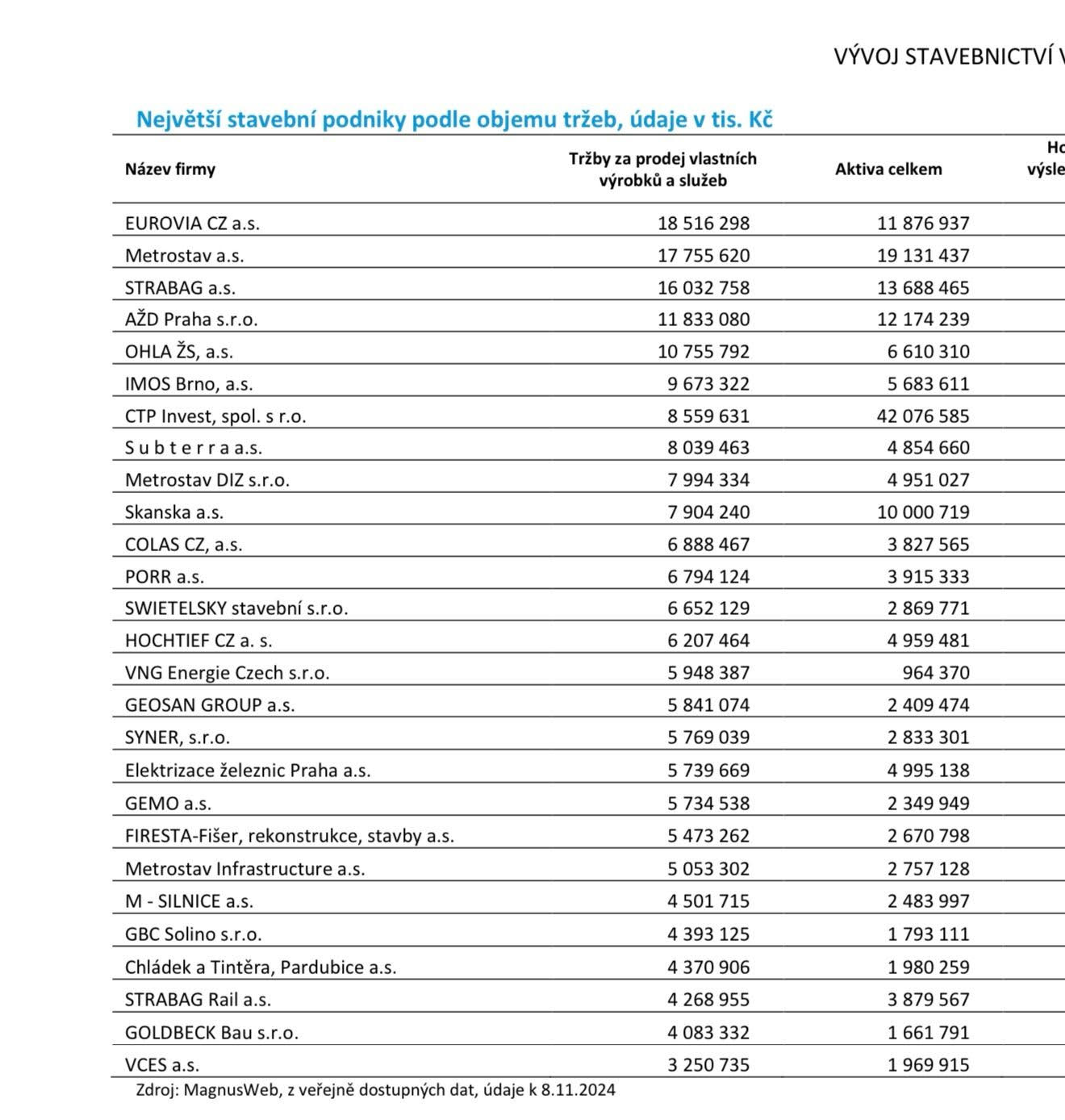 Kolik to je absolutně? Třicítka největších stavebních firem v Česku měla roku 2023 tržby dohromady zhruba 220 miliard Kč, jak plyne z dat ministerstva průmyslu (viz tabulka níže).