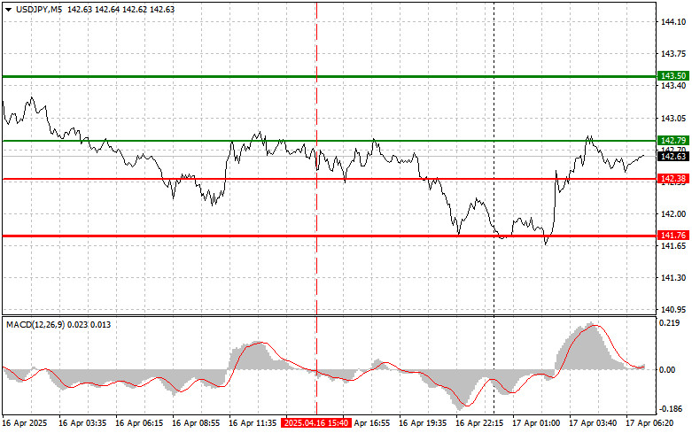 Scénář č. 2: Pár USD/JPY plánuji prodat i v případě dvou po sobě jdoucích testů úrovně 142,79, když MACD bude v zóně překoupenosti. To by omezilo růstový potenciál a mohlo by vést k obratu směrem dolů. Očekávejte pokles k opačným úrovním 142,38 a 141,76.