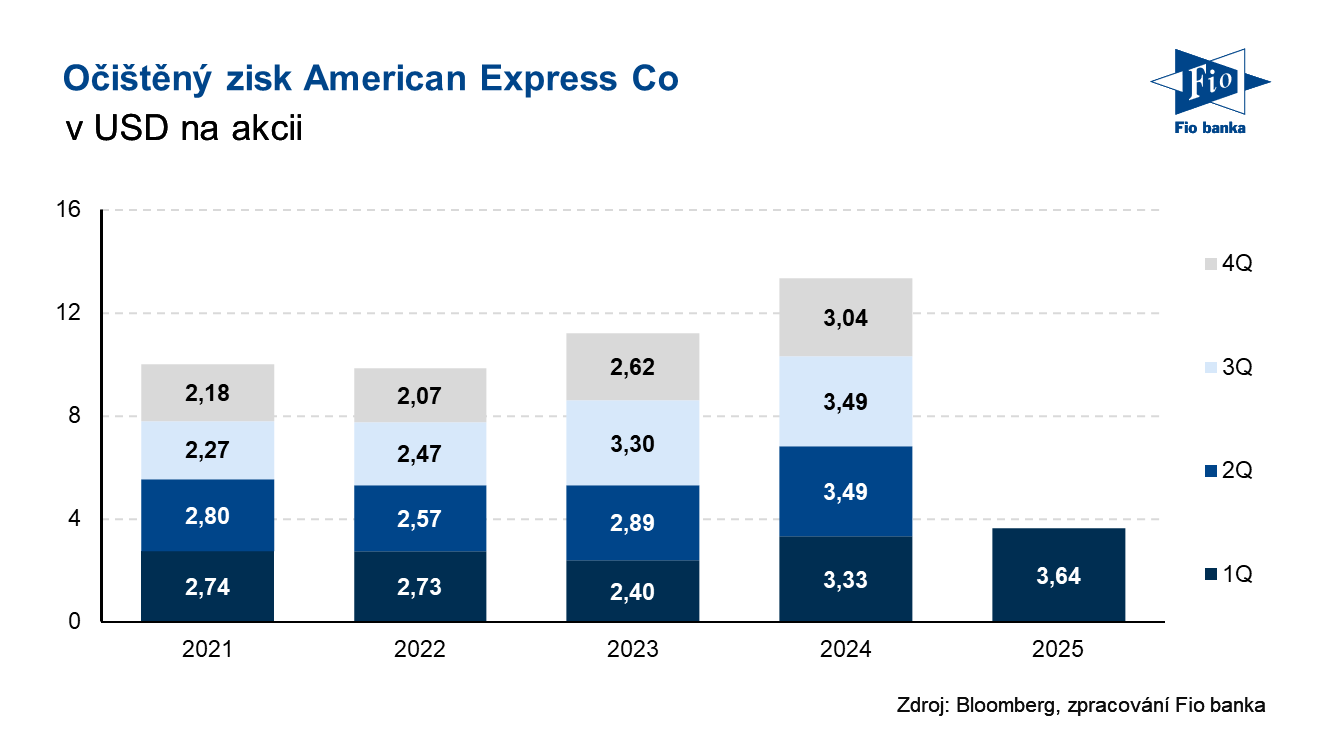 Americká finanční společnost American Express vydávající kreditní karty a další finanční produkty zveřejnila výsledky za první kvartál roku 2025. Očištěný zisk na akcii překonal odhady analytiků, zatímco výnosy byly v souladu s jejich očekáváním. Pozitivně byl hodnocen i fakt, že firma potvrdila svůj celoroční výhled. Podle analytiků za tím stojí především silné a stabilní výdaje majetnější klientely, která zůstává aktivní i přes nejistotu a volatilitu spojenou s celní politikou.