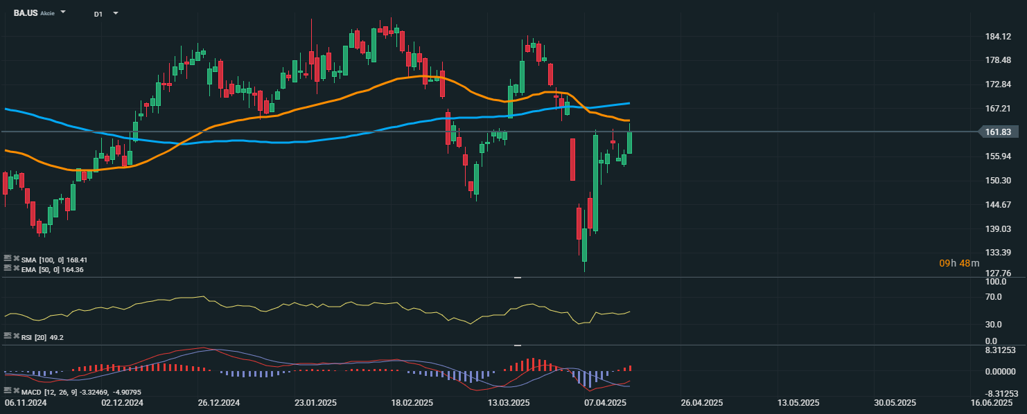 Akcie Boeingu se pohybují na ceně 161,83 USD, přičemž narazily na rezistenci v blízkosti EMA 50 na úrovni 164,36 USD a zároveň se pohybují pod SMA 100, která leží na hodnotě 168,41 USD, což značí stále medvědí trend ve střednědobém horizontu.