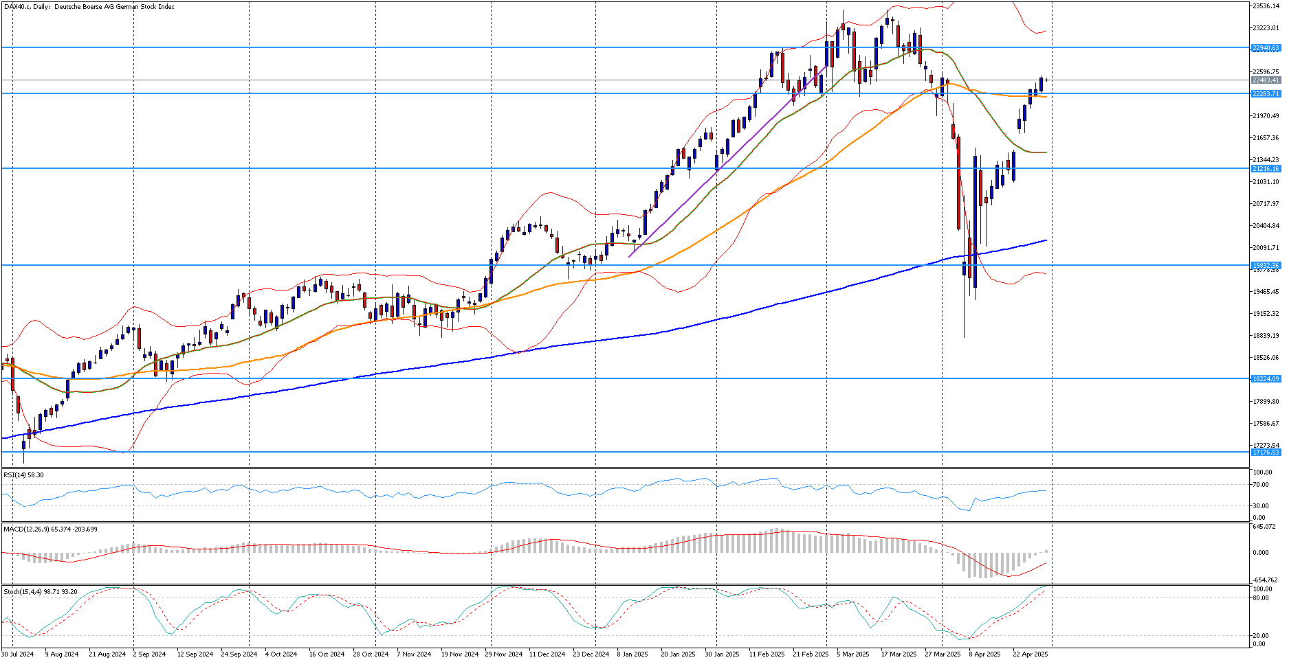 Index DAX40 zažívá devátou zelenou seanci za posledních jedenáct obchodních dní. Podle ředitele evropského oddělení MMF bude německá fiskální expanze potenciálně kompenzovat vyšší obchodní zátěž způsobenou výraznými americkými celními sazbami. Mezitím nedávné zmírnění celních hrozeb USA, zejména cel uvalených na automobilové součástky, podpořilo náladu investorů. Technické ukazatele naznačují býčí trend, neboť MACD se nachází vysoko nad svou spouštěcí linií. Kromě toho se MACD postupně zvyšuje a dostal se do kladného teritoria. Stochastický oscilátor však sice zůstává v překoupené oblasti, ale právě překročil svou spouštěcí linii, což zvyšuje možnost korekce. Mezitím se ukazatel RSI vyrovnává mírně nad neutrální úrovní. Aktuální cena indexu GER 40 se nachází výrazně nad 20-, 100- a 200-SMA, což odráží nedávný výrazný růstový trend. Pokud by býci zůstali u moci, mohl by index DAX40 zpočátku otestovat úrovni 22 500 bodů. Dále by se mohl pokusit vystoupat k horní Bollingerově hranici na úrovni 23 050 bodů. Na druhou stranu, pokud bude nálada investorů zasažena možnou patovou situací v obchodních jednáních, index DAX40 by mohl zpočátku otestovat 50denní SMA na úrovni 22 230 bodů. Ještě níže by mohl najít pevnou podporu v oblasti 21 300-21 700, kde jsou velmi frekventované 20- a 100denní SMA. Index DAX40 dosáhl výrazného oživení, přičemž ukazatele hybnosti stále podporují býčí trend a odrážejí slibný dopad rozsáhlého plánu fiskálních výdajů Německa a nedávný apetit USA k bilaterálním obchodním dohodám. Bezprostřední rezistenci lze proto nalézt na úrovni 22 500 bodů.