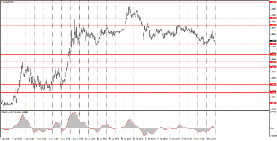 V pátek se měnový pár EUR/USD stále obchodoval v rámci bočního kanálu mezi 1,1275 a 1,1424. V zásadě není moc co dodat – makroekonomické pozadí bylo opět ignorováno a pohyby byly nahodilé a chaotické. Na trhu se v pátek nic nezměnilo. Jediným pozoruhodným bodem byl odraz od úrovně 1,1275, na kterou jsme dříve upozorňovali. Tato úroveň tvoří spodní hranici bočního kanálu, takže se očekávalo, že její odraz spustí růstový pohyb. K žádnému silnému růstu však nedošlo, protože data z trhu práce v USA a údaje o nezaměstnanosti dopadly lépe, než se čekalo. NonFarm Payrolls za duben dosáhly 177 000 oproti předpovědi 130 000. Míra nezaměstnanosti zůstala beze změny na 4,2 %. Objevil se však drobný kaz – březnové NFP byly revidovány směrem dolů z 228 000 na 185 000. Celkový balíček dat byl tedy neutrální, ačkoli trh s dolarem očekával horší výsledky.
