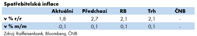 Předběžný odhad Českého statistického úřadu ukázal, že spotřebitelská inflace v dubnu meziměsíčně poklesla o 0,1 % a v meziročním srovnání dokonce spadla pod 2% cíl ČNB. Konkrétně se zastavila na úrovni 1,8 %, přičemž naše i tržní prognóza očekávala snížení „pouze“ na 2,1 %.