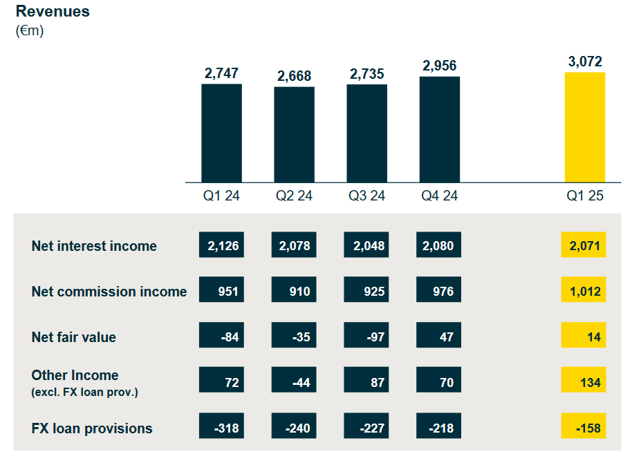 Na výnosech společnosti se z největší části podílejí čisté úrokové výnosy, které dosáhly 2,07 mld. EUR. V meziročním srovnání klesly o 2,6 %. Predikovalo se 2,02 mld. EUR.