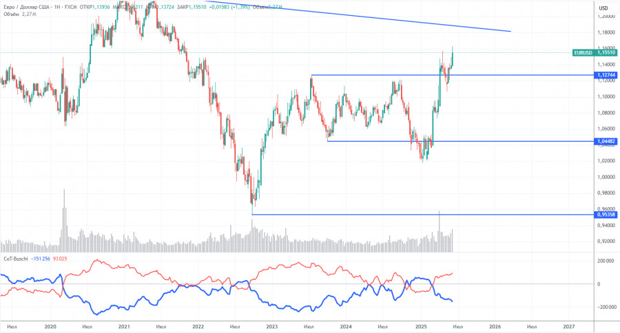 Nejnovější COT report je datován k 10. červnu. Jak ukazuje graf nahoře, čistá pozice nekomerčních obchodníků je dlouhodobě býčí. Medvědi na konci roku 2024 krátce převzali kontrolu, ale rychle o ni přišli. Od chvíle, kdy se Donald Trump stal prezidentem USA, dolar jen oslabuje.