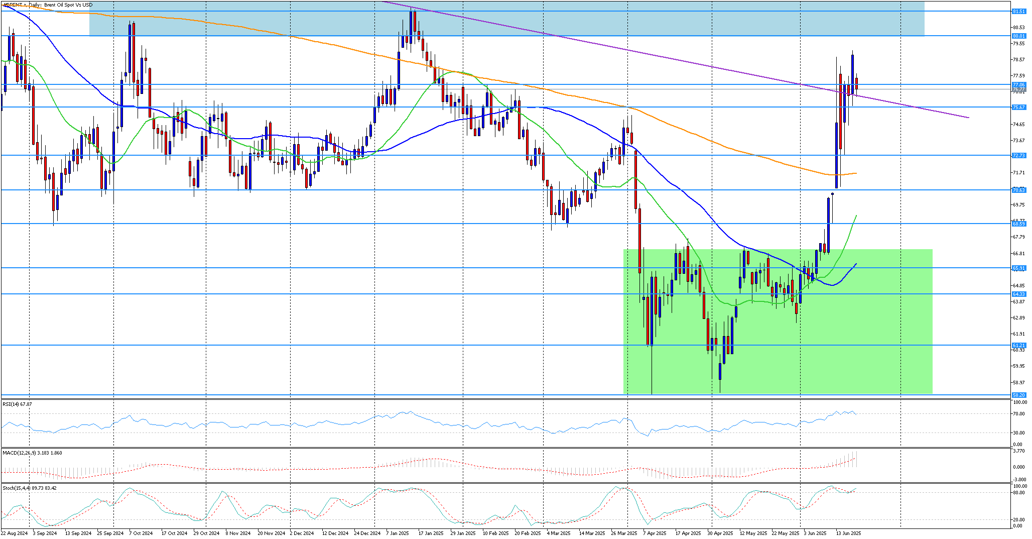 Velký propad oproti pondělním maximům, a to zejména v důsledku geopolitického vývoje a nedávné dohody mezi Izraelem a Íránem, kterou zprostředkoval bývalý americký prezident Donald Trump. Přestože cena v předchozí seanci dosáhla pětiměsíčního maxima 79,34, nedokázala udržet dynamiku nad dlouhodobou klesající trendovou linií, což posílilo širší medvědí výhled. -