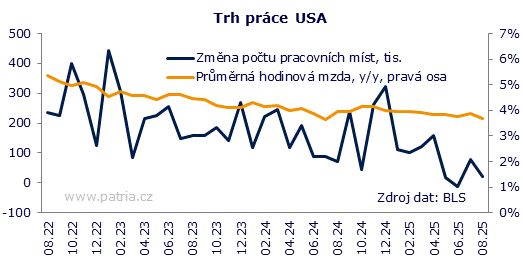 Pohled na vývoj finančních trhů v posledních pár dnech naznačoval, že se investoři těší, jak slabá čísla z trhu práce upevní tezi snižování úrokových sazeb. To se jim splnilo a dluhopisy i akciové futures na cenách rostou. V případě akcií si však vůbec nejsme jisti, že data představují důvod k radosti... Nejsledovanější část reportu, údaj o nových pracovních místech, byl velmi slabý. Za srpen jen 22 tisíc, zatímco se čekalo 75 tis. Údaje za předchozí dva měsíce byly revidovány opět dolů, ale tentokrát jen mírně. Na slabém výsledku se částečně podepsal veřejný sektor, ale to je jen malá útěcha. Soukromý sektor vykázal +38 tis. míst zásluhou školství a zdravotnictví či pohostinství. Dál už to vypadá hůř: další propad v řadě ve specializovaných službách, snižování stavů v průmyslu i stavebnictví, mírný pokles ve finančním a informačním sektoru. Sektor obchodu a dopravy, kde dokážou být fluktuace velké, tentokrát počet míst jen nepatrně navyšoval. Průzkum v domácnostech naznačuje za srpen nárůst nezaměstnanosti. Její míra se zvedla v souladu s odhady na 4,3 procenta. Zároveň z průzkumu ale vyplývá nárůst počtu zaměstnaných při současném slušném přílivu nových duší na trh práce. To s daty z firem neladí. Jde ale o běžný jev, a zvláště průzkum v domácnostech je silně volatilní. Mzdy v srpnu držely meziměsíční tempo 0,3 procenta. Meziročně jsou o 3,7 procenta výš, zatímco se čekalo zpomalení z 3,9 jen na 3,8 pct. Počet odpracovaných hodin za týden zůstává na 34,2. Celkový objem mezd je meziročně vyšší o 4,3 procenta a v dynamice sledujeme mírně sestupný trend. Data z trhu práce nelze hodnotit jinak než jako špatná. Už čtvrtý měsíc v řadě je velmi slabý, což se běžně neděje a nemůžeme tedy hovořit o nějaké jednorázové odchylce. Problémy vidíme na obou stranách: Poptávku firem brzdí nejistota a vyhlídky dopadů cel do jejich byznysu (viz reporty ISM), zatímco nabídku dusí tažení proti imigraci, které přišlo, když měl trh minimální volné kapacity. Ve výsledku tak nemusí docházet k velkému nárůstu nezaměstnanosti, ale zaměstnanost bude čelit omezení a s ní i dostupná kapacita pro ekonomiku. Dopad na cenu práce zatím vidět příliš není. Pro dluhopisy jde o pozitivní zprávu, když sílí očekávání na agresivnější postup Fedu a naopak slábne strach z inflace. Sledujeme prudký propad výnosů, a to více na kratším konci, když 2Y splatnost je nyní -12 bps. Od Fedu se čeká klasické 25bps snížení sazeb na zářijovém zasedání, ale do konce roku jsou celkem v cenách už skoro 3 taková snížení, zatímco dosud se trh klonil spíše ke dvěma. Dolar nepřekvapivě reaguje oslabením. Na akciovém trhu jsme viděli pozitivní reakci po zveřejnění dat a futures i dál rostou, naznačujíce pozitivní poslední den týdne. V tomto případě ale pozitivní náhled s trhem nesdílíme. Snižování sazeb je sice pro akcie příznivé a pomáhá držet vysoké valuace, ale jeho urychlení situaci tolik nemění. Z našeho pohledu převažuje to, že trh práce během pouhých dvou měsíců ovlivnil pohled na ekonomiku jednoznačně negativně. Konsensuální výhled pro HDP na roky 2025 a 26 se dosud průběžně zvedá, což ale kvůli trhu práce zřejmě skončí a optimismus bude třeba krotit. Pro zajímavost k dnešním datům můžeme dodat, že jejich zdroj (BLS) krátce před zveřejněním ohlásil technické problémy, respektive nedostupnost nástrojů pro jejich stahování. Ministr obchodu Howard Lutnick z problémů okamžitě obvinil vedení úřadu a vyzval k jeho výměně. Na reakci Donalda Trumpa zatím čekáme. Jestliže šéfku úřadu nechal vyhodit už minulý měsíc, je otázkou, koho vyhodí po dnešních ještě horších číslech.