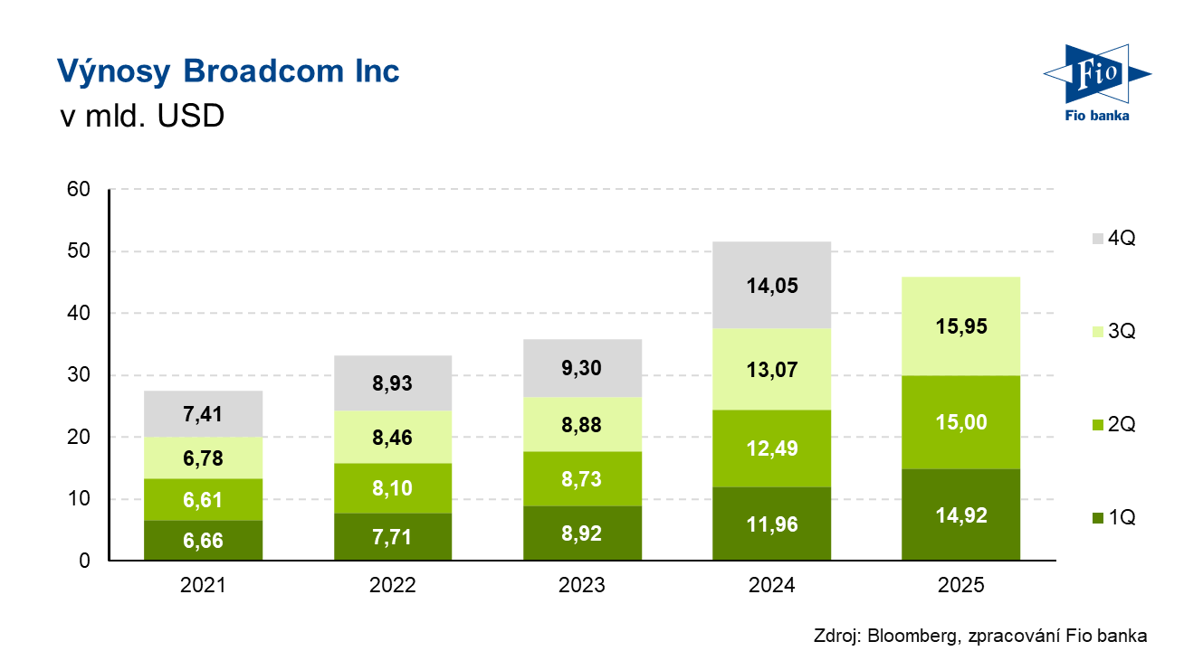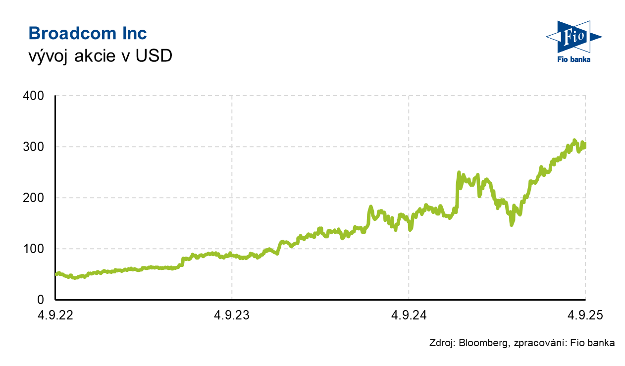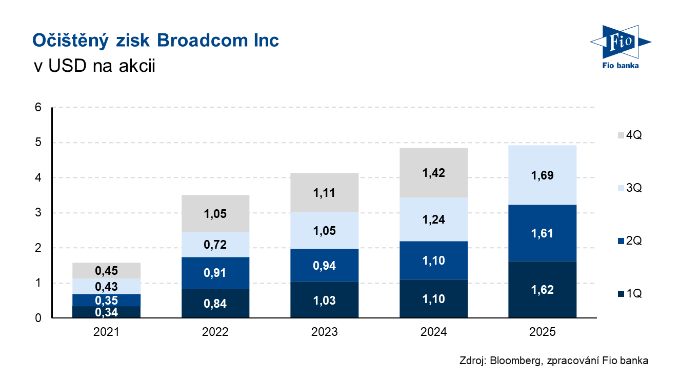 Klíčová slova: Akcie | Bloomberg | Cash flow | Dividenda | Dividendový výnos | P/E | Ukazatel | Výnos | Zisk na akcii | USD | JPMorgan | Zisk | Výsledky | EPS | Analytika | Banka | Fio banka | Cena | Fio | Trh | Cílová cena | EBITDA | ROCE | Tržby | Kapitalizace | Výhled | Konsensus | Výnosy | Očekávání analytiků | Očekávání | Kapitálové výdaje | Čistý zisk | Hospodaření | Výsledky hospodaření | Zisk EBITDA | Provozní zisk EBITDA | Provozní zisk | Meziroční růst | Výdaje | Free cash flow | Vývoj | Růst | Očekávané výsledky | Vedení společnosti | Výrobce čipů | Vývoj akcie | Americký výrobce | AI | Společnosti | Společnost | Výsledky společnosti | Broadcom | 3М | Jakub Němec | Tržní odhad | OpenAI | Americký výrobce čipů | Očištěný zisk na akcii | Fio banka, a.s. | Výroba čipů | AVGO | Akcie Broadcom |