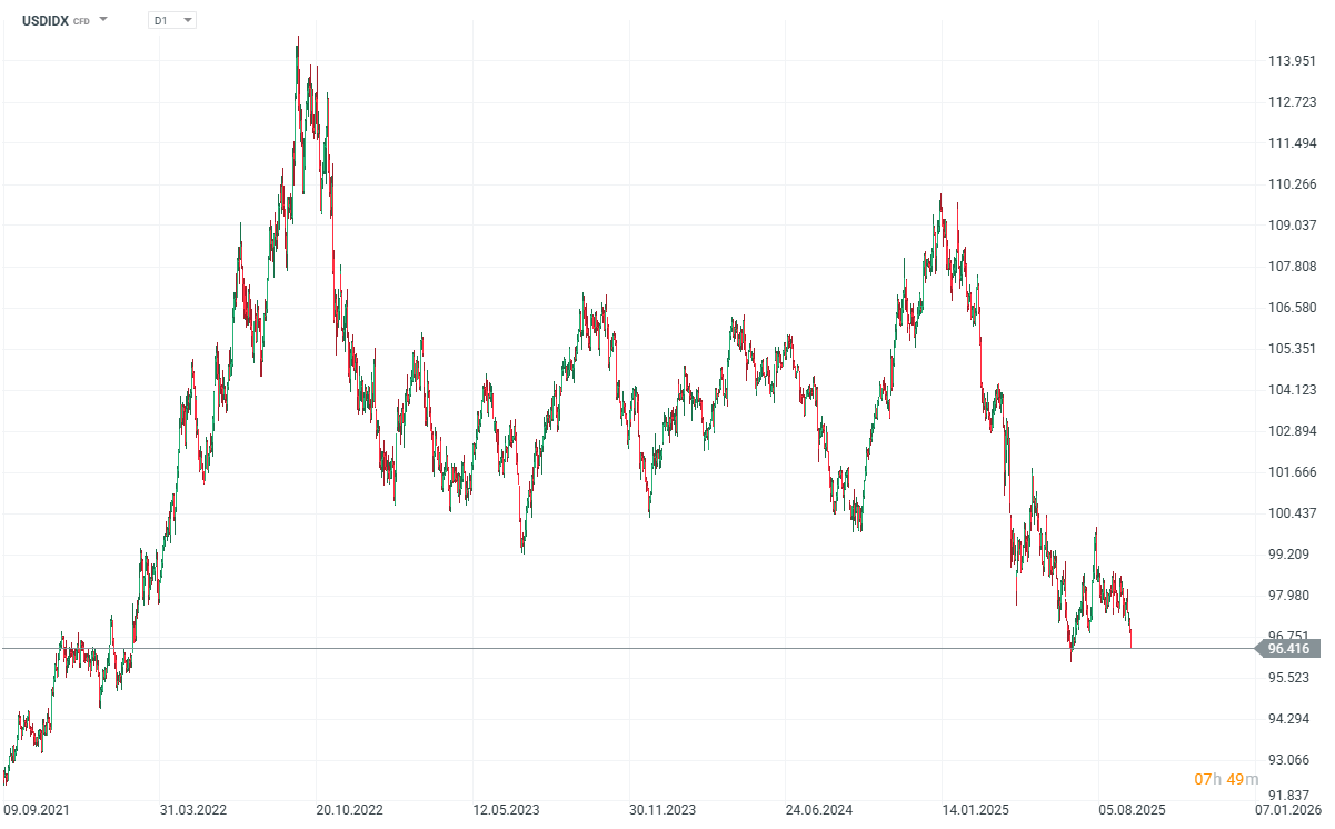 Taková reakce trhu může naznačovat, že investoři stále více spekulují na možnost agresivnějšího snížení sazeb ze strany Fedu, než s jakým dosud počítal konsenzus. Tento pohled však může být zpochybněn skutečností, že u amerických státních dluhopisů není vidět odpovídající pohyb. Jak vidíme níže, futures na US Dollar Index (USDIDX) ztrácí 0,5 % a znovu testuje víceletá minima.