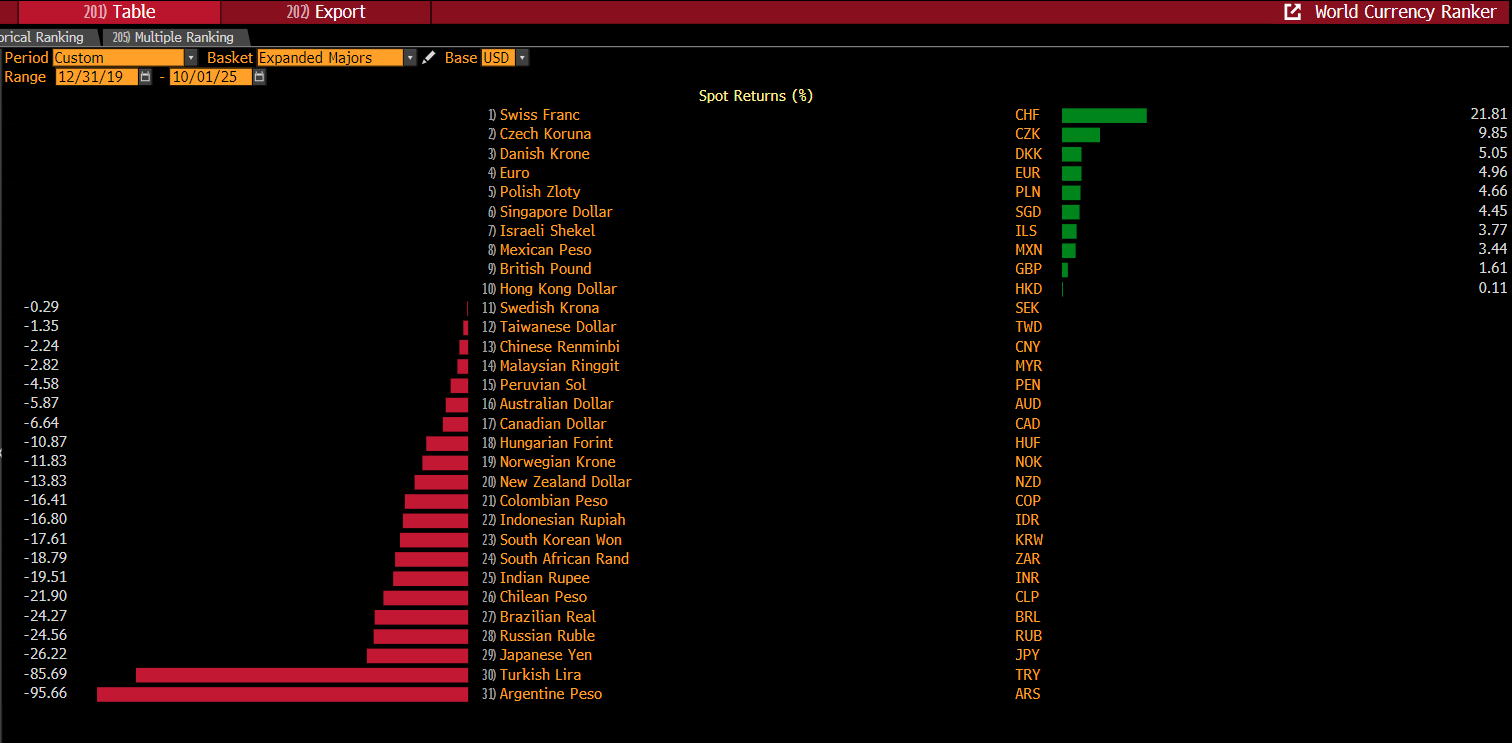 Česká koruna společně se švýcarským frankem představují dvě významnější světové měny, které od začátku roku 2020 zpevňují vůči dolaru vůbec nejvíce na světě. Frank přidává takřka 22 procent, česká koruna pak skoro deset procent (viz graf Bloomberg níže). Euro zpevňuje o necelých pět procent. Většina světově významnějších měn ale od začátku roku 2020 do dneška vůči dolaru ztrácí, včetně švédské nebo norské koruny, maďarského forintu, japonského jenu nebo čínské měny.
