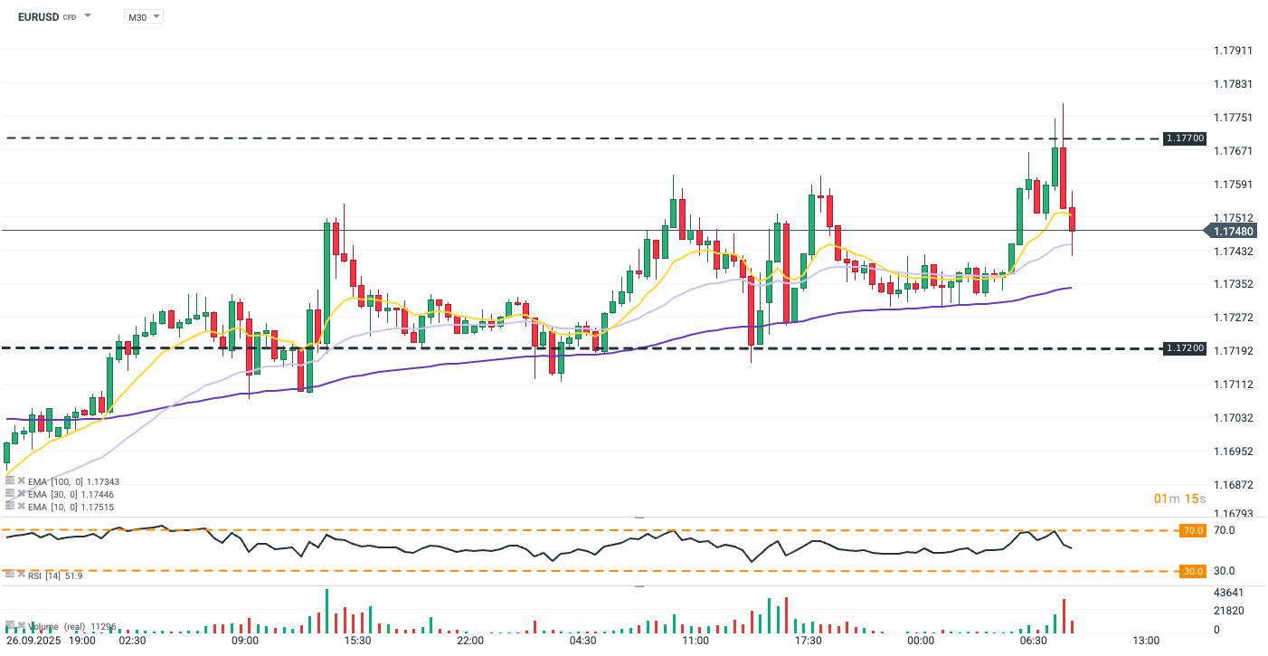 EUR/USD se po slabších PMI údajích stáhl od klíčové rezistence poblíž 1,1770. Přestože čísla mírně překonala očekávání, stále ukazují na zpomalování podnikatelské aktivity v eurozóně, zejména při slabé poptávce.
