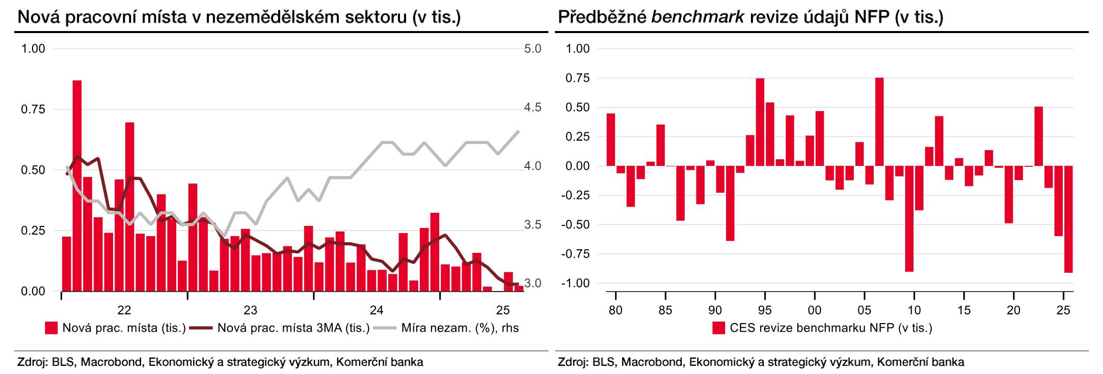 Skutečnost, že americký pracovní trh ochlazuje podtrhla nedávná každoroční předběžná revize statistik z trhu práce, která srazila růst zaměstnanosti za období březen 2024 až březen 2025 na polovinu až na 0,5 %. To je dokonce nižší tempo oproti útle rostoucí ekonomice eurozóny, kde zaměstnanost v druhém letošním čtvrtletí meziročně narostla o 0,6 %. Přesto se míra nezaměstnanosti v USA k letošnímu srpnu zvýšila „pouze“ o 0,4 pb a dosáhla 4,3 %. Její samotná úroveň na poplach zatím nebije. Trh práce byl nicméně klíčovým argumentem pro americký Fed, který v minulém týdnu po devítiměsíční pauze obnovil cyklus snižování úrokových sazeb.