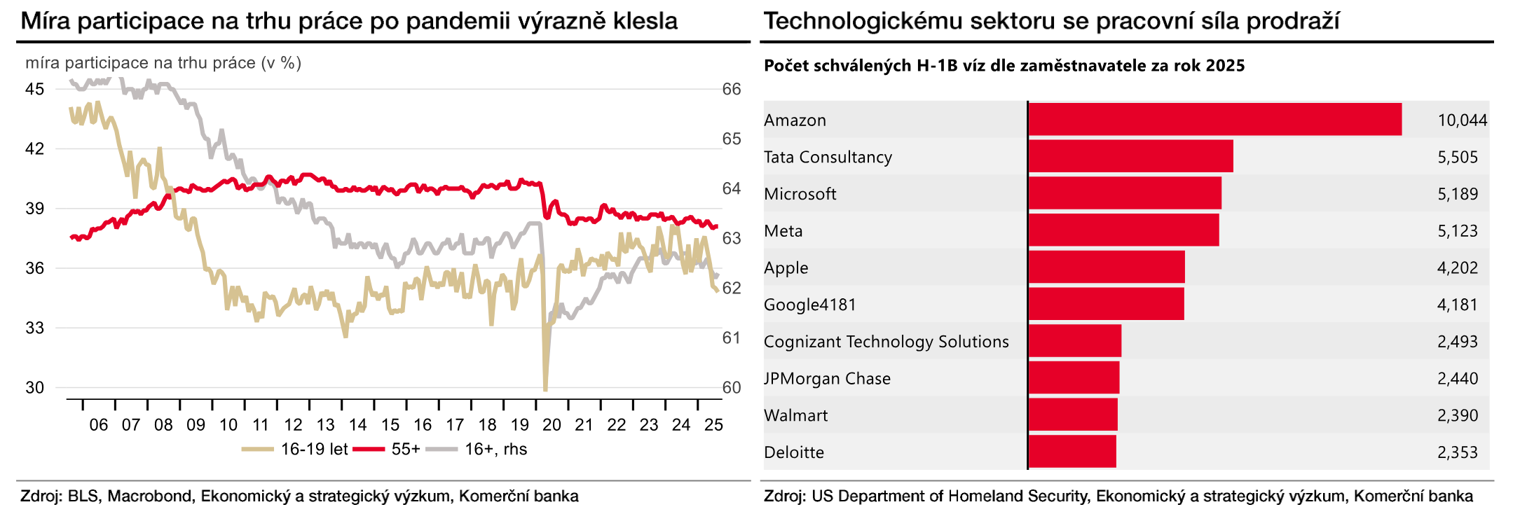 Pomineme-li ale krátkodobý horizont, tamní trh práce se postupně dostává pod větší tlak strukturálních problémů, které ještě eskalují kroky americké administrativy v oblasti imigrace, školství či obchodní politiky. Kombinaci slabého růstu zaměstnanosti a jen malého zvýšení míry nezaměstnanosti vysvětluje pohled na zásobnu amerických pracovníků. Míra participace na trhu práce (osob starších 16 let) od konce roku 2023 v USA postupně klesala a letos v srpnu dosáhla 62,3 %. To je o celý procentní bod níže oproti únoru roku 2020, po kterém trh práce ovlivnil pandemický šok. Firmy tak čelí i menší množině pracovníků, ze kterých si mohou vybírat. A snahy skrze obchodní politiku přitáhnout průmysl zpět na americkou půdu a vrátit práci americkým průmyslníkům nepředstavují příliš efektivní využití zdroje, který se v USA zdá být stále vzácnější.